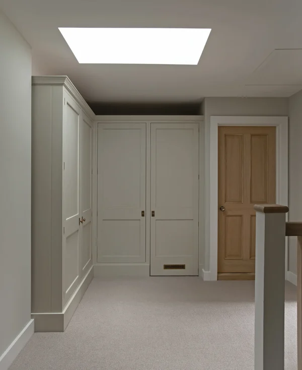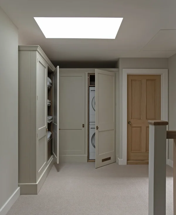 The laundry cabinets and linen storage are located on the first floor of the property for absolute ease and convenience, discreetly housing the washing machine and tumble dryer. Linen can be laundered, dried, and stored in the adjacent cupboards, making this practical addition both efficient and elegant. It further supports the home during busy times, when the estate is full of family or guests.