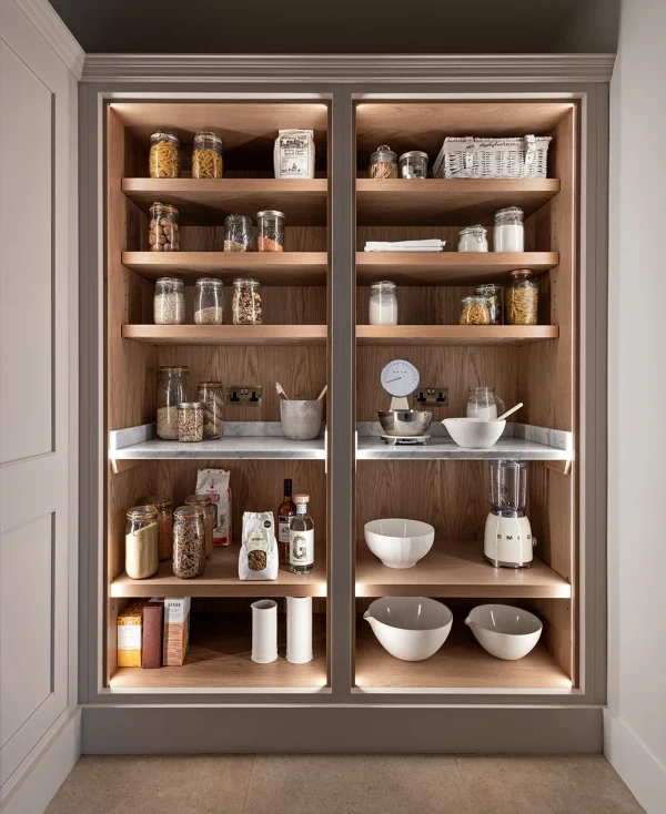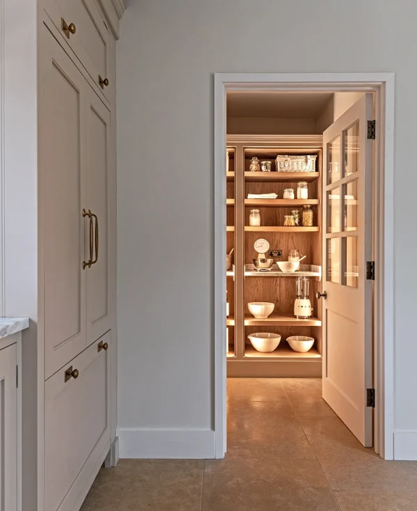 The pantry is an essential feature of this rural country estate, providing ample long-term storage. It houses an additional full-height fridge and freezer, making it the perfect support to the kitchen when the house is full of guests. With solid oak shelving, stone surfaces, and subtle bespoke lighting, it is as beautiful as it is practical. This well-stocked pantry complements the sociable kitchen space, offering both function and charm in equal measure.