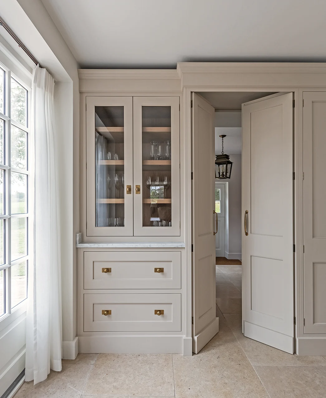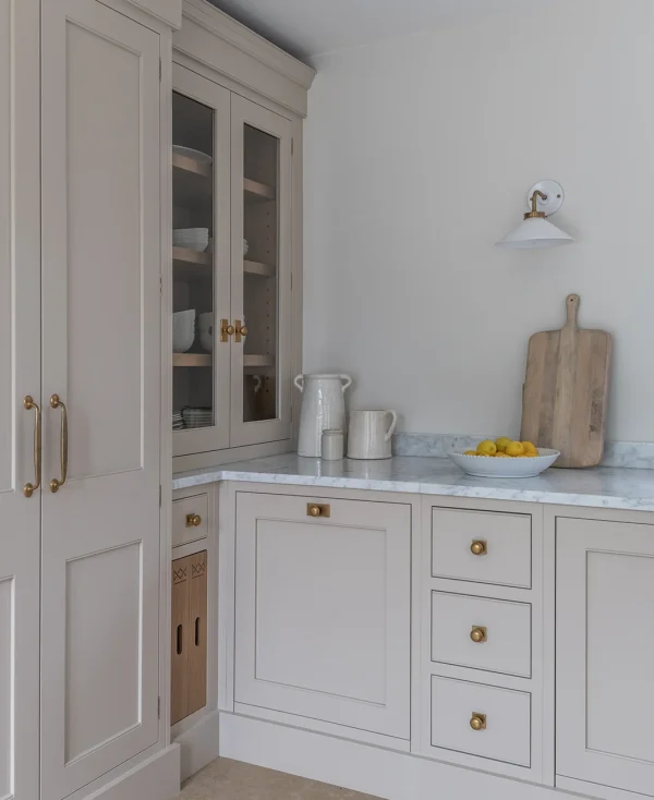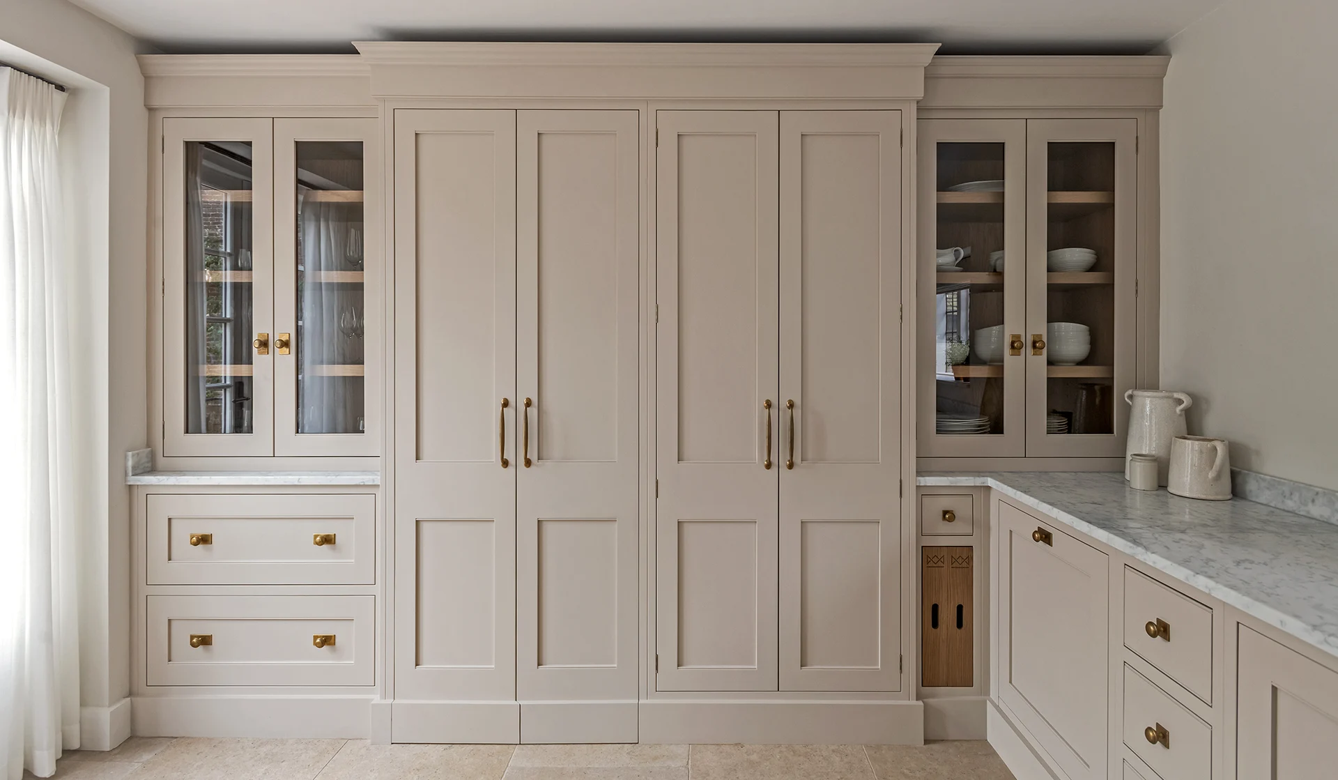 The layout has been carefully considered, creating a sense of rhythm and order throughout. Tall glazed cupboards form a focal point, while a discreetly integrated secret door adds a layer of intrigue. Generous crockery storage is paired with a dedicated home for everyday appliances, finished internally in practical yet luxurious stone.