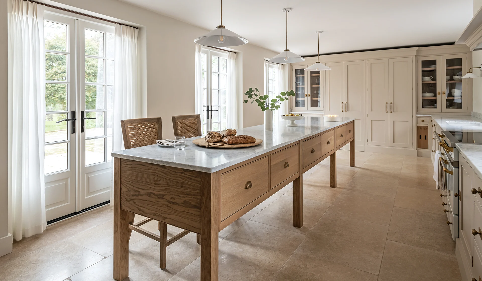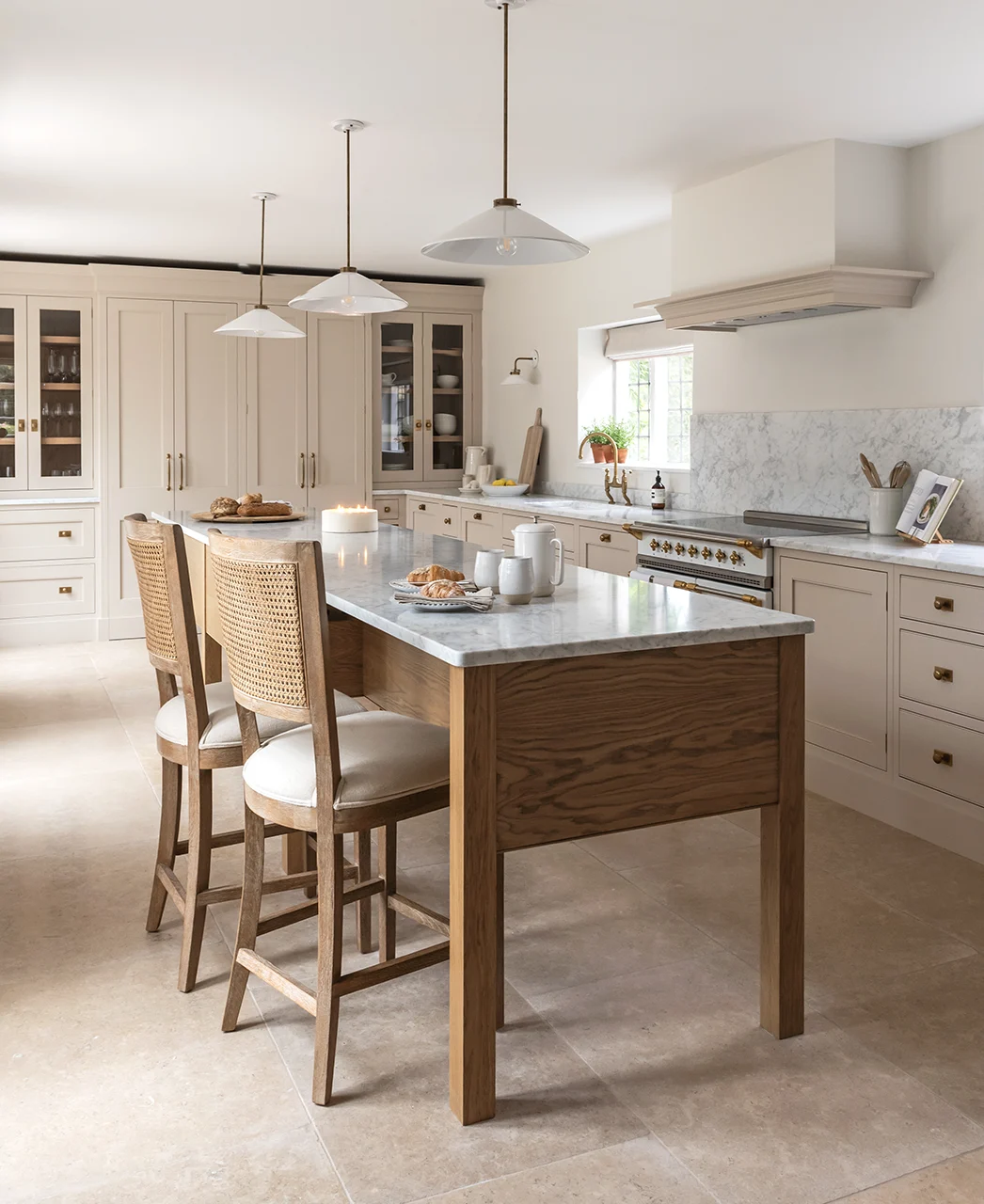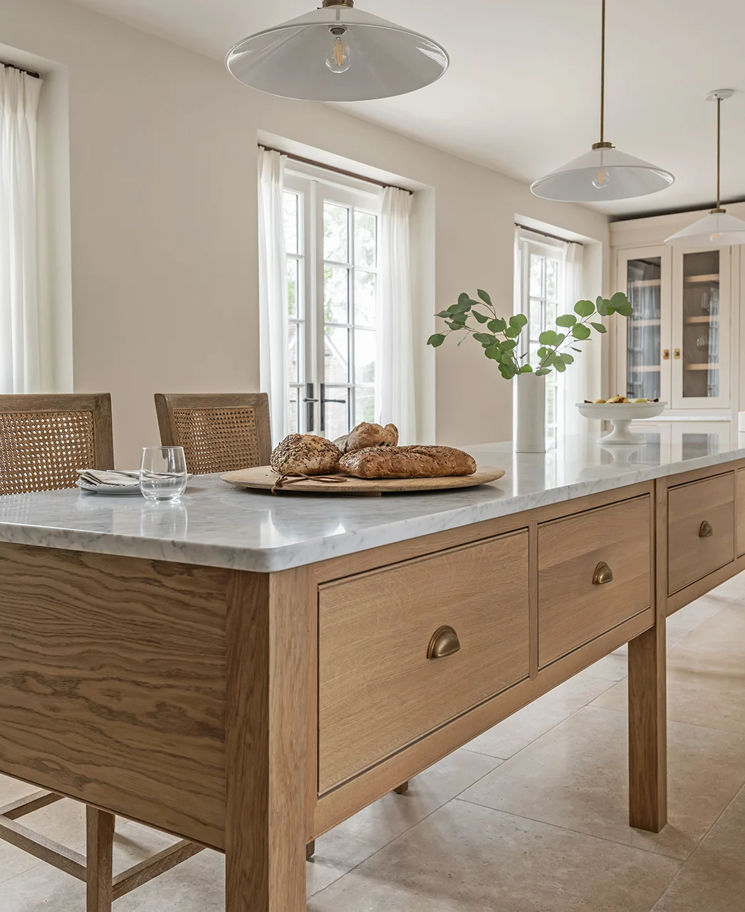 The layout has been carefully considered, creating a sense of rhythm and order throughout. Tall glazed cupboards form a focal point, while a discreetly integrated secret door adds a layer of intrigue. Generous crockery storage is paired with a dedicated home for everyday appliances, finished internally in practical yet luxurious stone.
