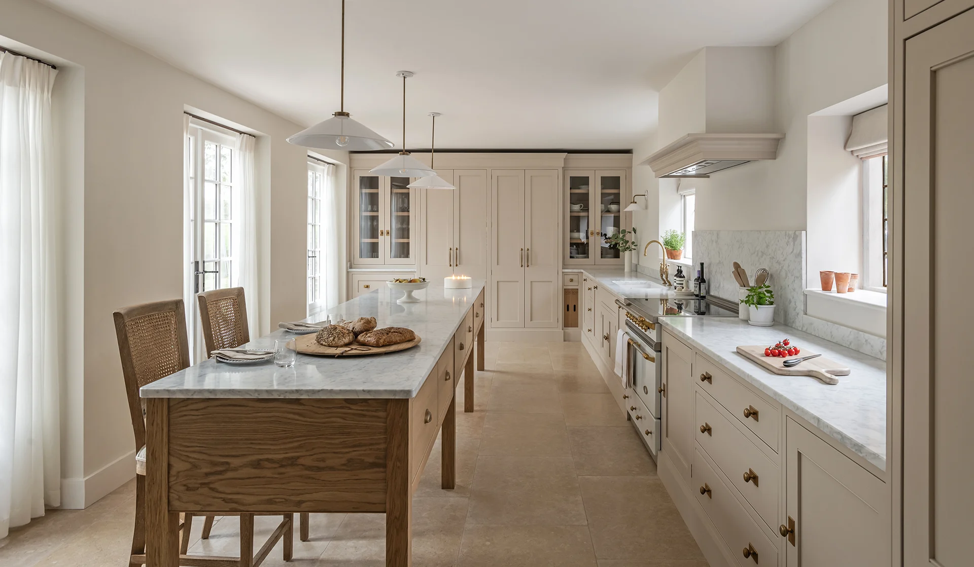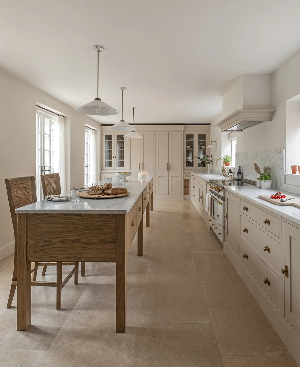The sink and cooking elevations are aligned with the windows, bringing balance and symmetry to the room, with the range cooker positioned as a central feature. Integrated refrigeration is seamlessly housed within the cabinetry, ensuring the family’s daily essentials remain close at hand, supported by a walk-in pantry adjoining the kitchen.