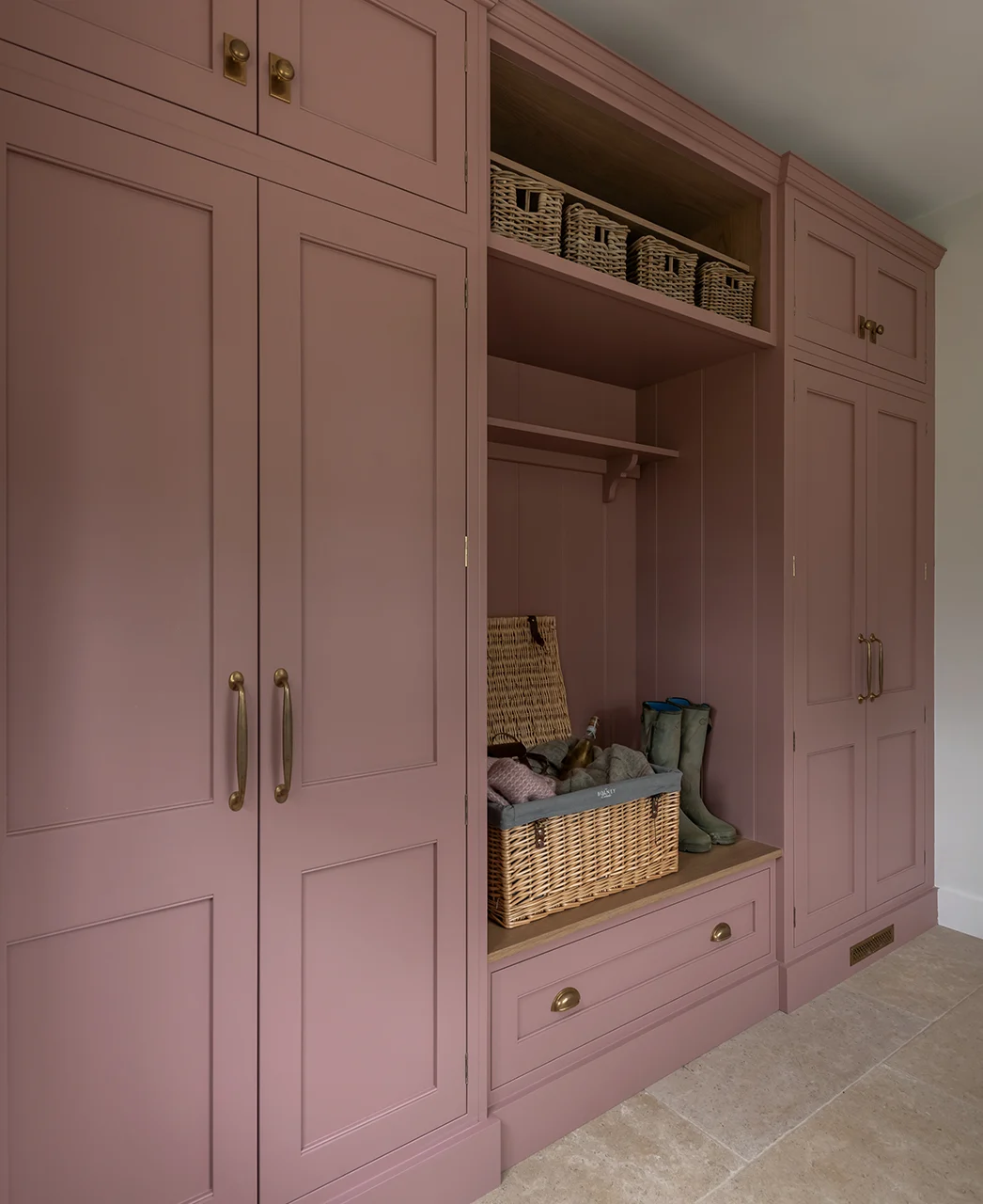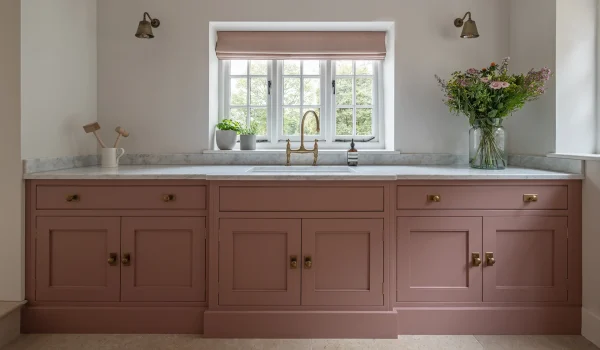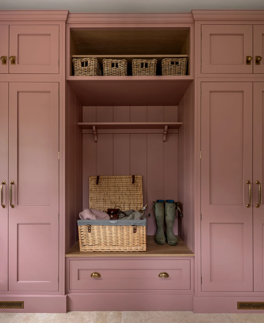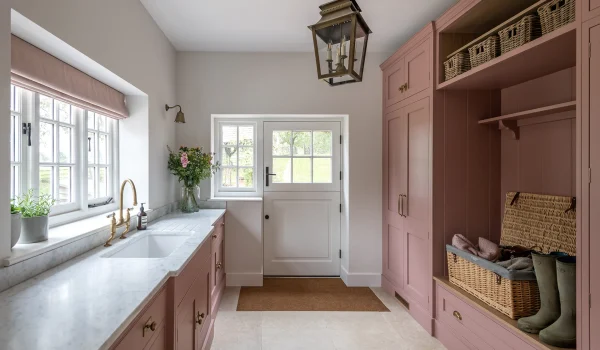 The bootroom serves as the entrance to the country estate from the grounds and is not only serviceable and hardworking, but breathtakingly beautiful. In blush, it mirrors the English roses that grow in the formal gardens outside. As the home has a laundry, this is a dedicated space for coats, wellies, and the extra layers that country pursuits demand. With a generous sink, it is the perfect place to prepare vegetables from the estate’s kitchen garden, as well as ample space to arrange flowers.